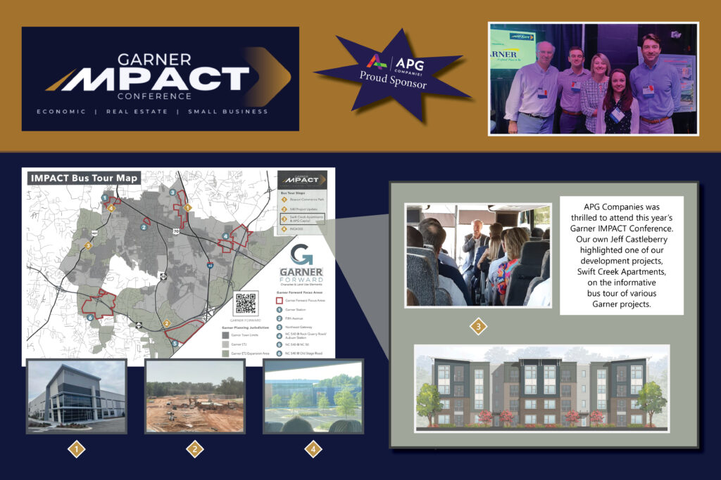APG Companies was a proud sponsor for the sold-out 2023 Garner IMPACT Conference, which included updates on the town’s accelerating economic growth and a panel discussion on the rise of medical-related development, followed by a bus tour through Garner to see major projects under construction, newly completed or in the pipeline.